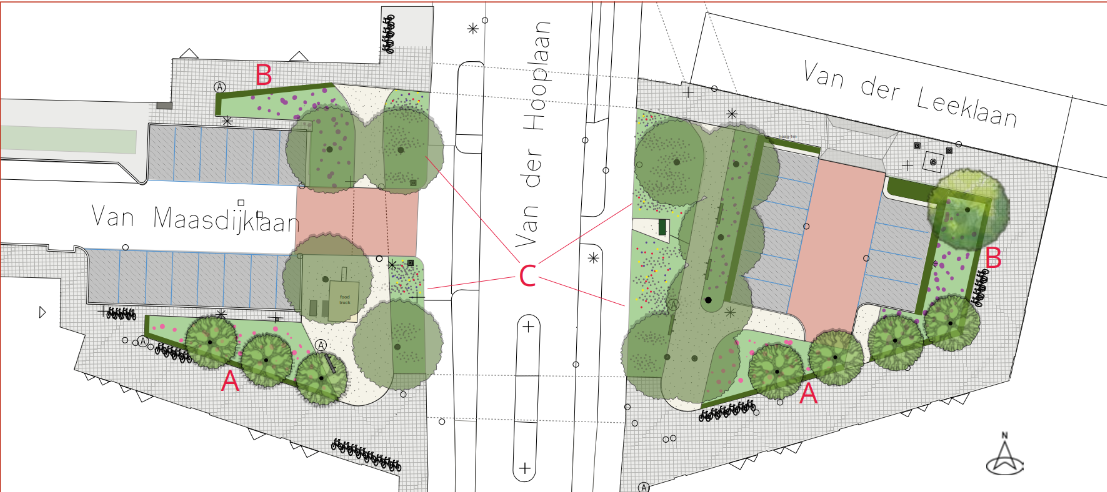 - Langs de parkeervakken worden groenvakken gemaakt met herfstbloeiende heesters, afgezet met liguster- en meidoornhagen. Op de hoek met de Van der Leeklaan wordt een zomereik toegevoegd